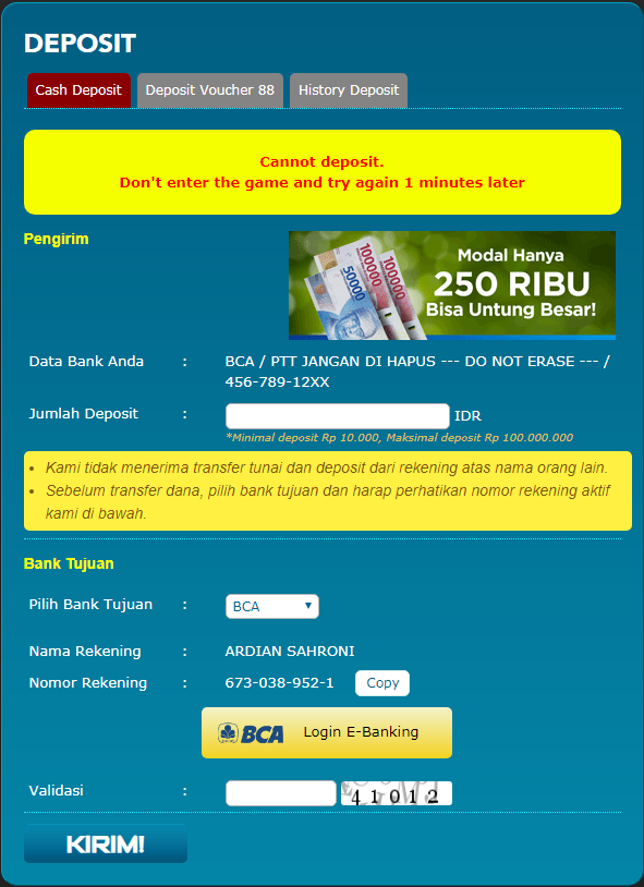 4. Selalu memperhatikan rekening tujuan yang tersedia di menu deposit. Apabila rekening tidak terlihat di menu deposit jangan melakukan transfer dana kerekening tersebut. Rekening aktif adalah rekening yang terlihat di menu deposit.